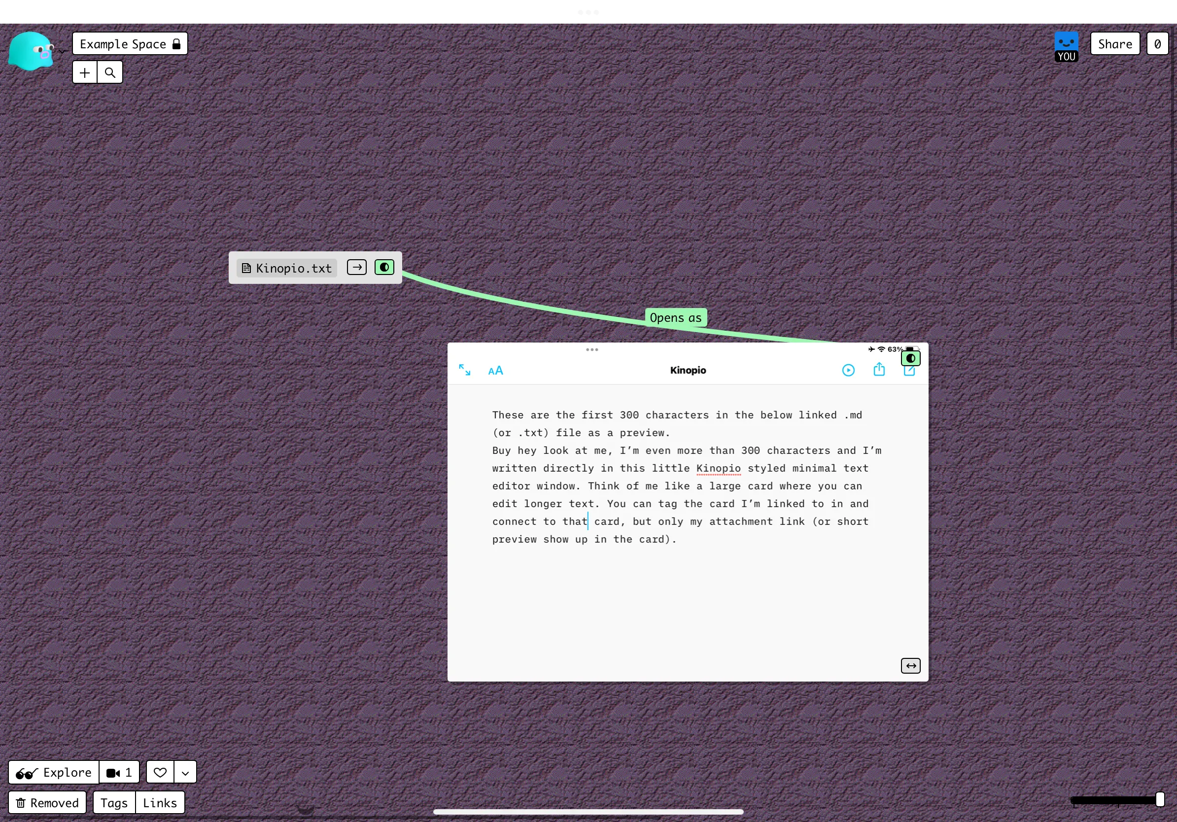 The idea here is, when you drop in a txt file, to have a simple way to edit it without having to download, open in a text editor, and then reupload to Kinopio.